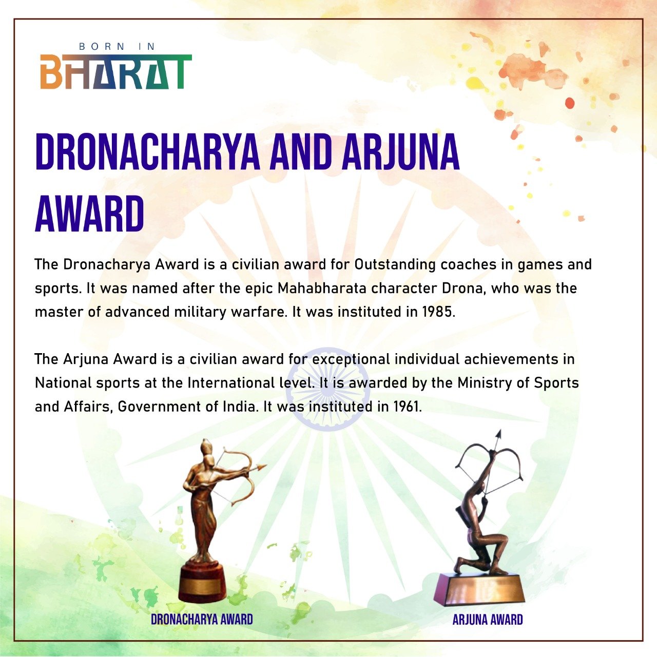 The Dronacharya Award is a civilian award for Outstanding coaches in games and sports. It was named after the epic Mahabharata character Drona, who was the master of advanced military warfare. It was instituted in 1985.The Arjuna Award is a civilian award for exceptional individual achievements in National sports at the International level. It is awarded by the Ministry of Sports and Affairs, Government of India. It was instituted in 1961.